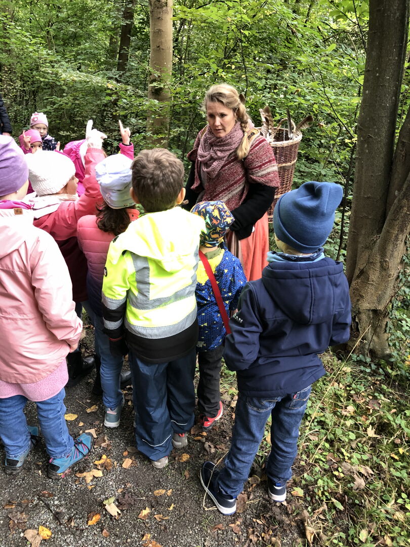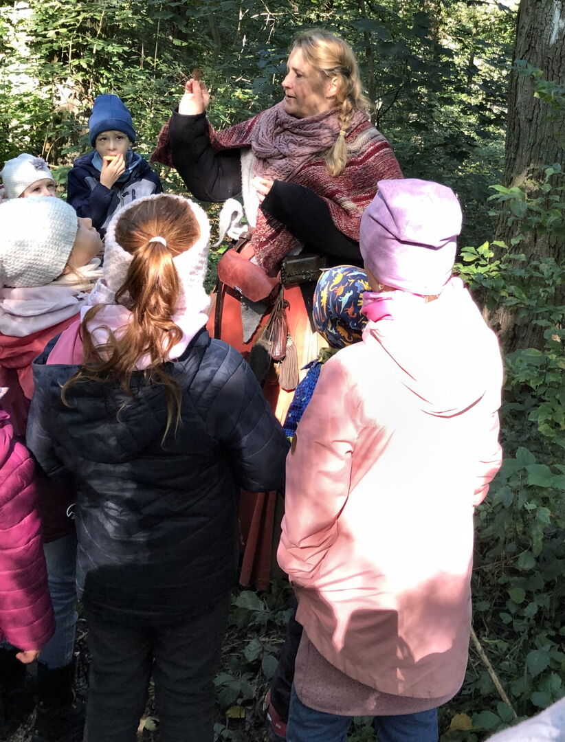 Plötzlich tauchte sie auf und hatte Angst - und das vor uns. Als Erstes wurde geklärt, dass wir alle nicht böse sind und sie vor UNS keine Angst zu haben braucht. Dann ging es kreuz und quer, bergauf und bergab durch den Eschbachwald auf der Suche nach den verschwundenen Erzählsteinen. Mit der tatkräftigen Hilfe der Kinder konnten diese bis zum Schluss alle gefunden werden. Und während der Suche danach hörten wir spannende Märchen. Am Ende der Wanderung waren nicht nur die goldenen Steine der Märchenhexe wieder da - sondern auch die Kinder um eigene goldene Steine reicher.